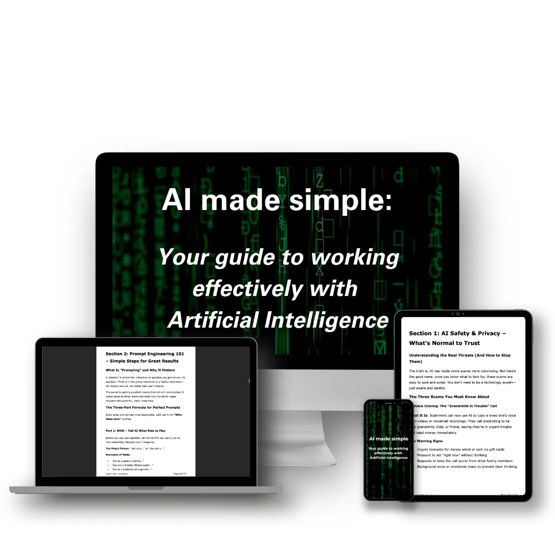 No confusing jargon, no assumptions that you already know what "prompts" or "AI assistants" are, and absolutely no judgment. Just clear, step-by-step instructions that show you exactly how to use AI safely, teach you how to avoid the most dangerous scams, and help you to start saving 10-15 hours every week on time-consuming tasks
